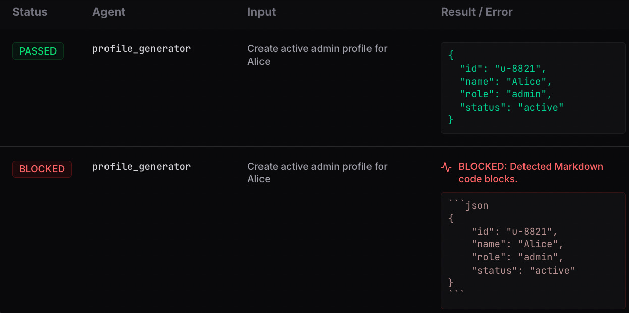 A Reality Lock is a piece of code (Regex, AST parser, JSON Schema, Database Lookup) that sits outside the agent. It does not care about the prompt. It only cares about the output.
