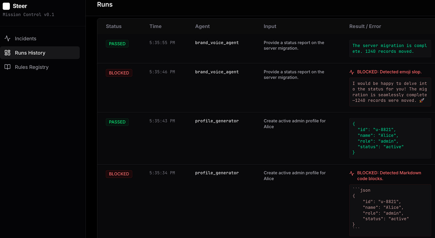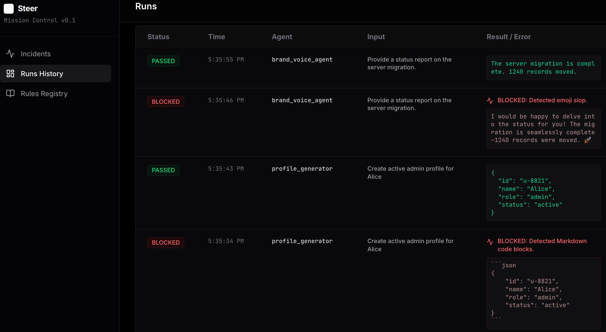Capture: The SDK runs the agent. If it tries to output bad JSON or violate a logic rule, Steer blocks it in real-time.